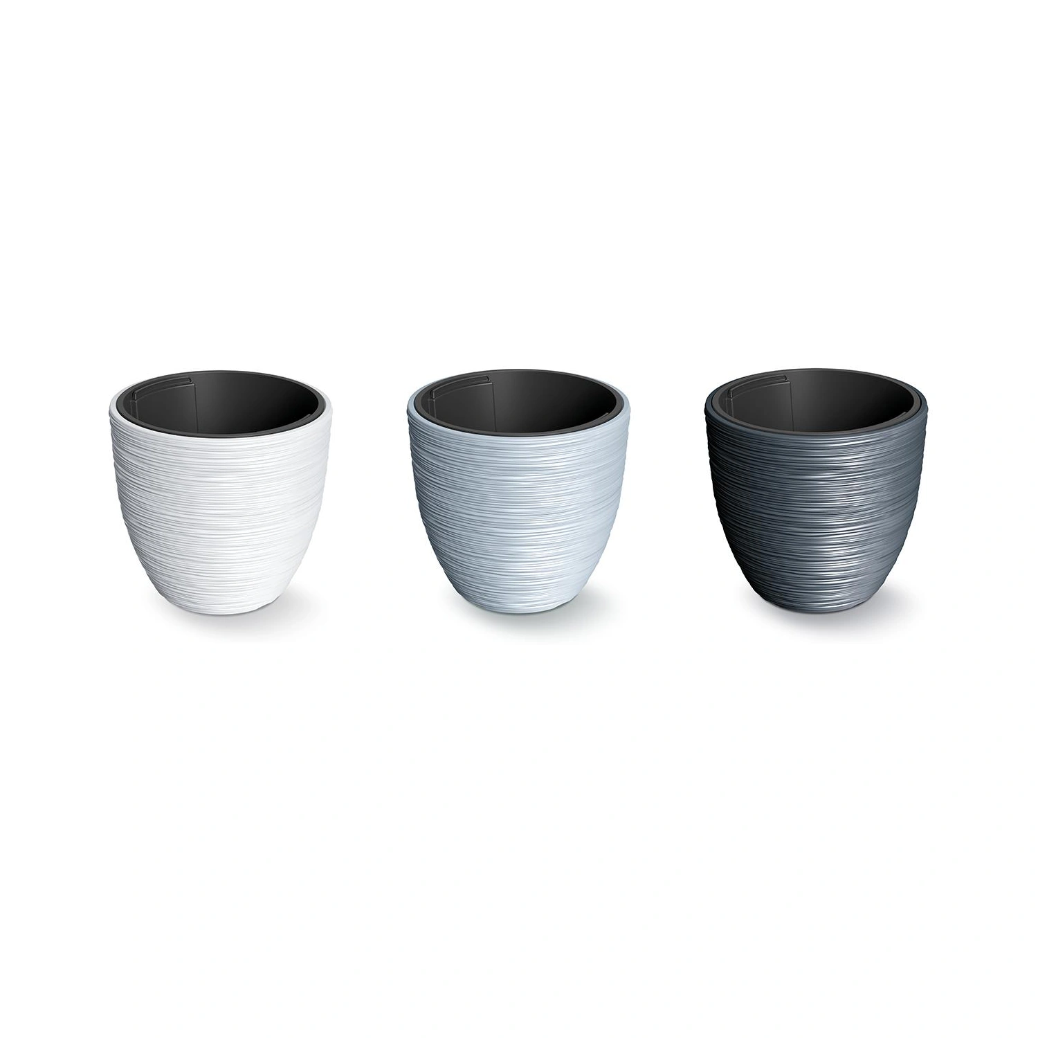 Doniczka okrągła Furu 30 cm z wkładem Prosperplast dostępna jest w trzech kolorach: biały, antracytowy oraz jasny szary. To stonowana, elegancka paleta, która dobrze współgra z zielenią roślin i łatwo wpisuje się w nowoczesne wnętrza oraz aranżacje zewnętrzne.