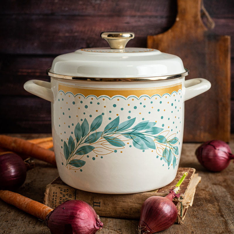 Kolekcja Metalac Green Line wyróżnia się dekoracyjnym roślinnym wzorem, delikatną kolorystyką i eleganckim wykończeniem. Dzięki temu garnek emaliowany nie tylko dobrze spełnia swoją funkcję, ale również pięknie prezentuje się na kuchennej półce czy płycie grzewczej. To propozycja dla osób, które lubią połączenie tradycyjnych naczyń z nowoczesnym, lekkim wzornictwem.