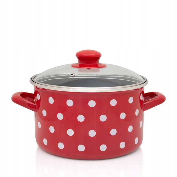 Garnek wykonany został z wysokiej jakości stali pokrytej trwałą emalią. Intensywny czerwony kolor z białym wzorem w groszki przyciąga wzrok, a szklana pokrywka z odpowietrznikiem pary ułatwia gotowanie. Idealne połączenie klasyki i nowoczesnego stylu.