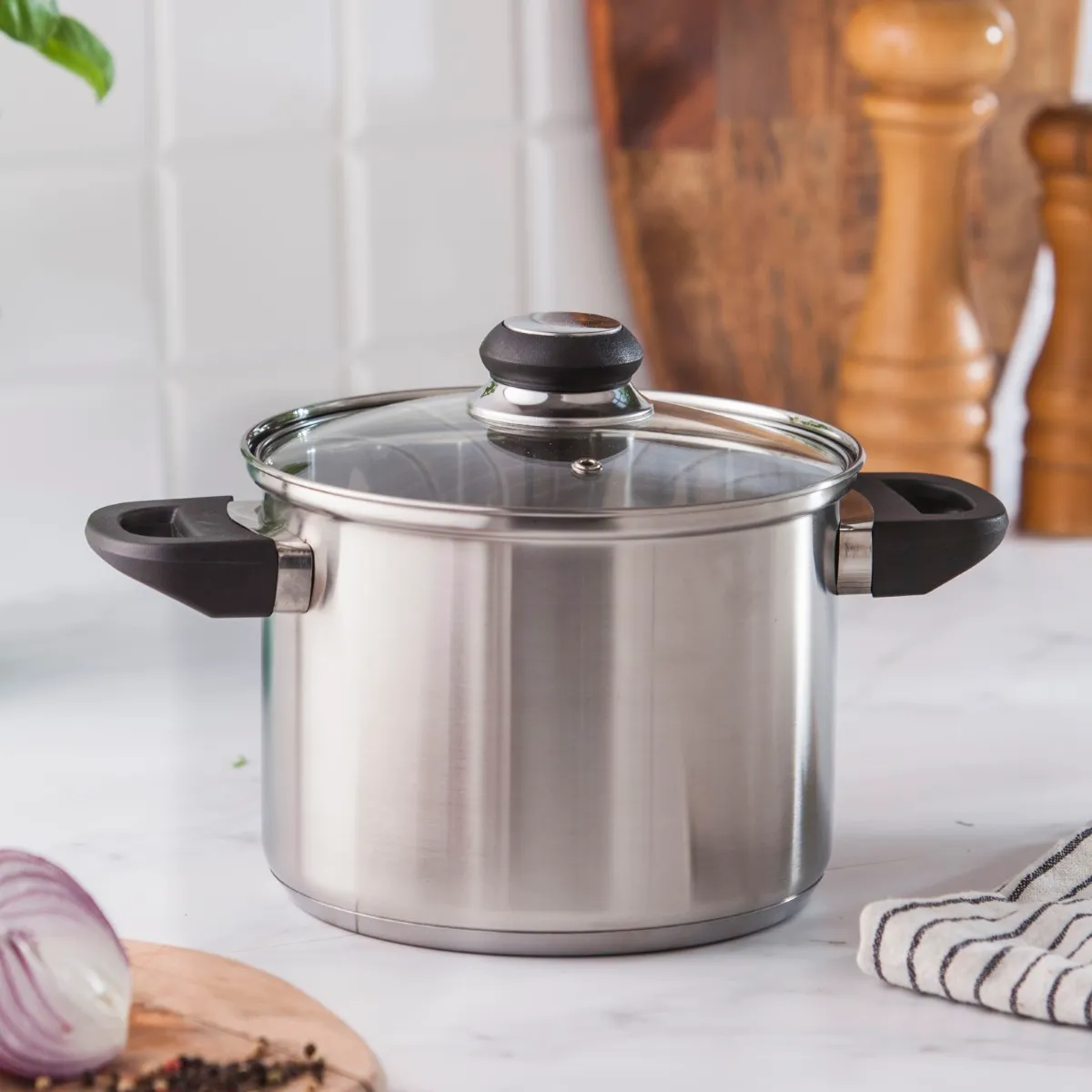 Stal nierdzewna to materiał bezpieczny w kontakcie z żywnością – nie wchodzi w reakcje chemiczne i nie zmienia smaku potraw. Szklana pokrywka pozwala kontrolować proces gotowania bez jej zdejmowania.
