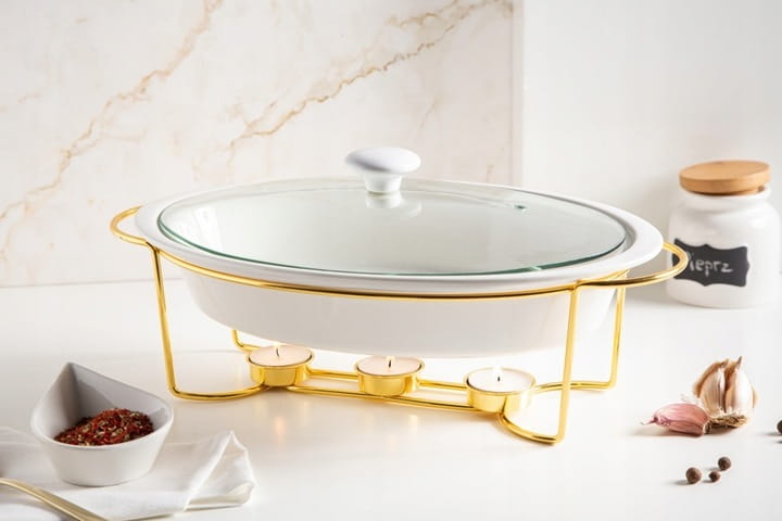 Wzbogać swoją kuchnię i stół o owalne naczynie porcelanowe 1,4 l, które łączy wyrafinowaną estetykę z praktycznym zastosowaniem. Wykonane z trwałej porcelany New Bone China, idealnie sprawdzi się do serwowania gorących dań – od zapiekanek po dania główne i przystawki. W zestawie znajduje się złoty stelaż z miejscem na tealight, który utrzymuje temperaturę potraw przez dłuższy czas.