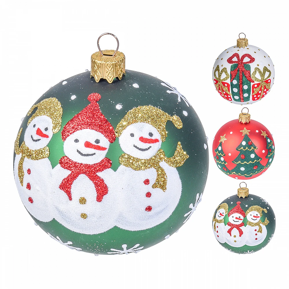 Piękne bombki szklane ze wzorami baławnków, prezentów i choinki.