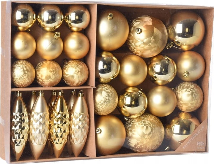 W zestaw znajduje się 31 sztuk bombek o różnych kształtach i wzorach,