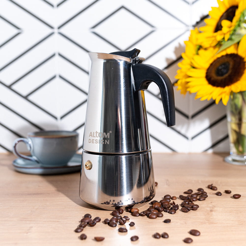 Czajniczek stalowy, ciśnieniowy do parzenia kawy.