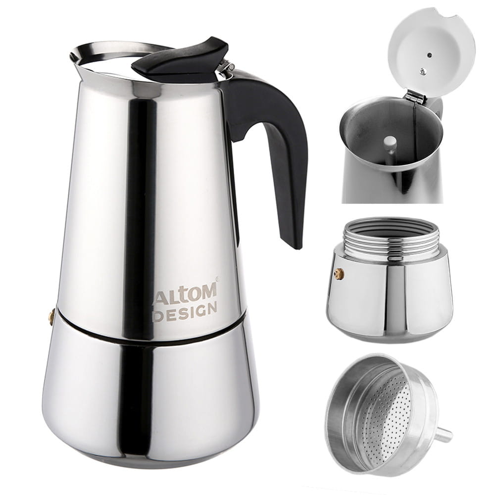 Czajniczek stalowy, ciśnieniowy do parzenia kawy.
