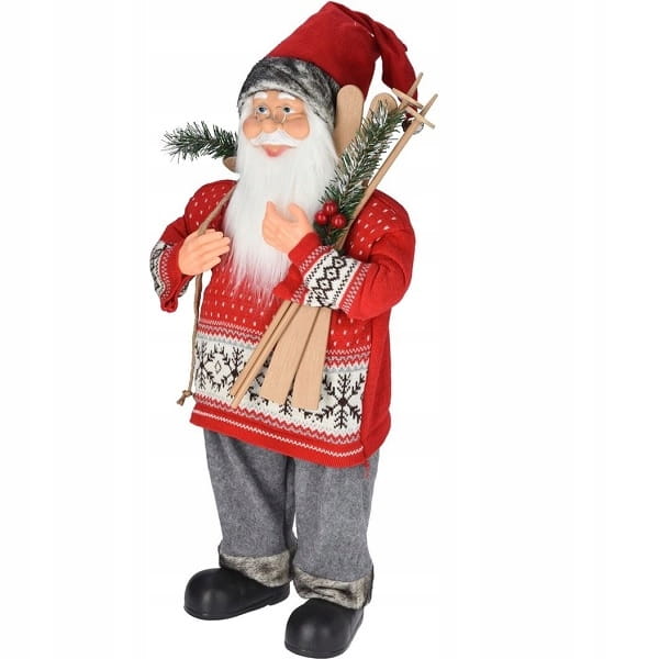 Dekoracja Święty Mikołaj z nartami to urocza świąteczna dekoracja, która nadaje się do wprowadzenia atmosfery do Twojego domu i na imprezy. Święty Mikołaj nosi stylowe szare spodnie, czerwony sweter i czapkę elfa na głowie. Mikołaj ma pod pachą małe narty i kijki, a na ramieniu torbę z prezentami.