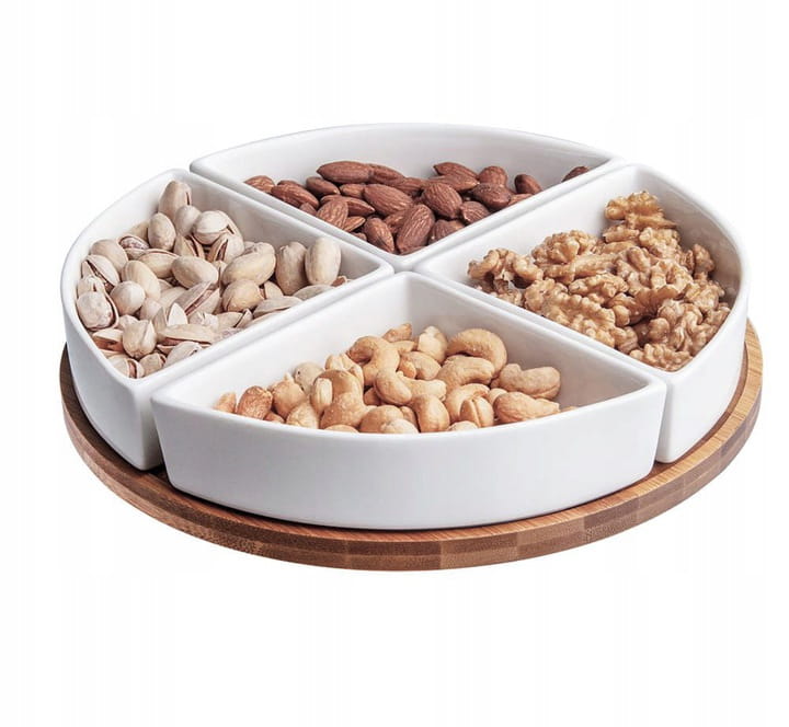 Zestaw naczyń na obrotowej tacy bambusowej idealnie sprawdzi się na przekąski, słodycze czy dipy.