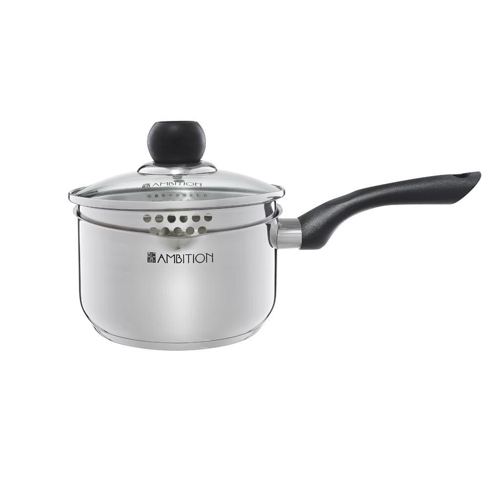 Rondel stalowy 16 cm o pojemności 1,5L z kolekcji Vikos marki Ambition to praktyczne rozwiązanie dla osób, które cenią wygodę i nowoczesne rozwiązania w kuchni. Model wyposażony jest w specjalną pokrywkę z systemem odcedzania, dzięki której nie potrzebujesz dodatkowego sitka ani durszlaka.