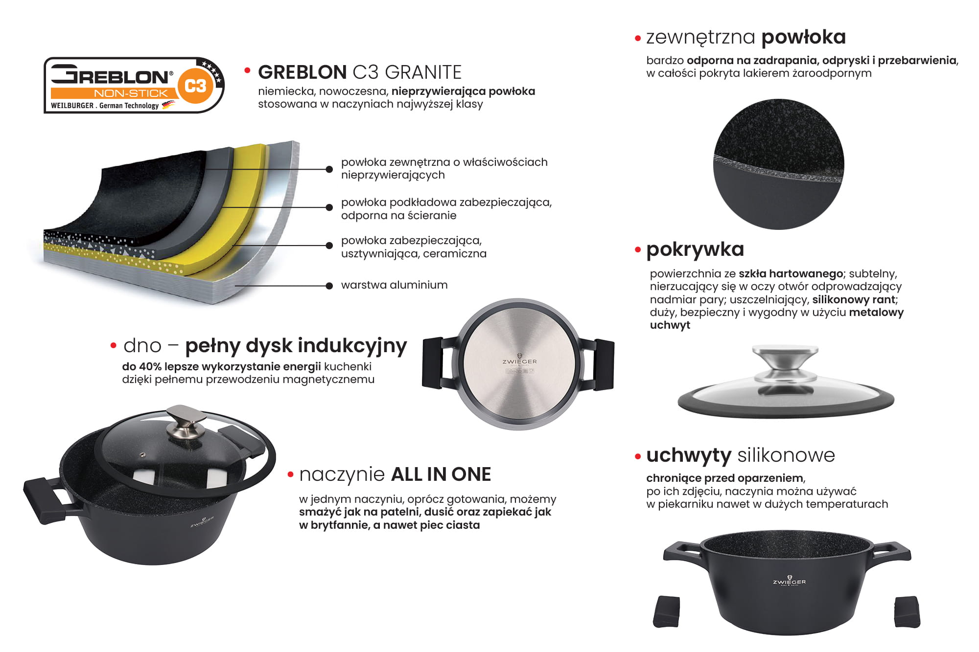 Można używać na wszystkich rodzajach kuchenek oraz myć w zmywarce.