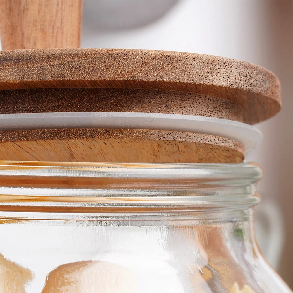 Pokrywka z drewna akacjowego została wyposażona w silikonową uszczelkę, która zapewnia szczelność i chroni produkty przed wilgocią oraz utratą aromatu. To rozwiązanie idealne do utrzymania świeżości żywności, a jednocześnie stylowy akcent, który pasuje do kuchni w stylu nowoczesnym, skandynawskim czy rustykalnym.